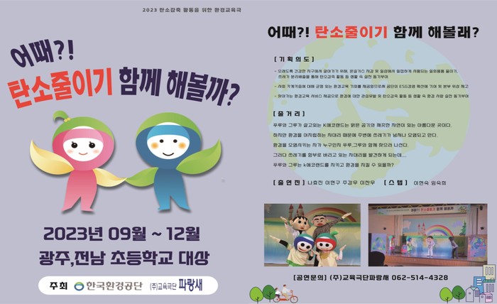또한, 수도권 및 도시지역과의 환경교육 격차 해소를 위해 광주와 전남 도서지역 등 17개 초등학교를 대상으로 10월부터 12월까지 환경교육 인형극 공연을 통해 3,418명의 학생들로부터 큰 호응을 얻은 바 있다.