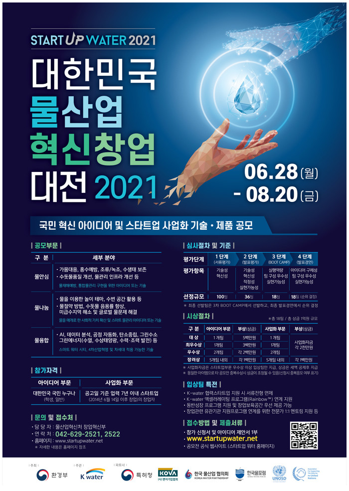 아울러 이번 공모전은 혁신아이디어의 사업화 연계와 전 세계 물문제 해결을 통한 세계 시장 진출을 돕기 위해 특허청, 한국물산업협의회, 한국물포럼, 벤처기업협회, 유엔 지속가능발전협회 등 관련 기관이 함께 참여해 국내외 판로개척 등 다양한 후속 지원을 펼칠 계획이다.