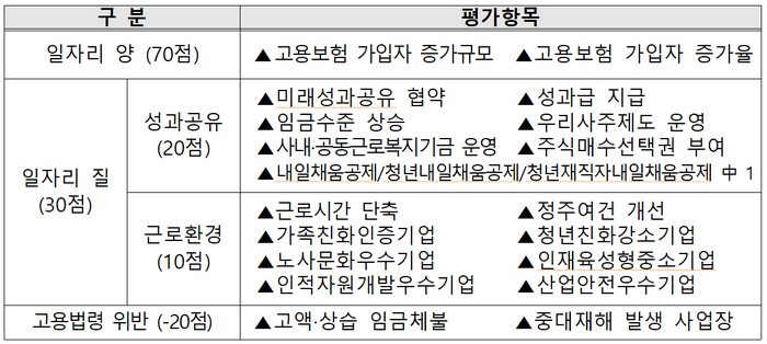 평가항목은, 일자리 양(70점), 일자리 질(30점), 법령 준수(감점)의 3가지로 구분되며, 고용창출 성과가 높은 ‘일자리 양 우수기업’과 ‘사업주 - 근로자 간 성과 공유 기업’, ‘근로시간 단축 기업’ 등 <일자리 질 우수기업>에서 고득점을 한 순서대로 지원 사업 선정평가 시 우대를 받을 수 있다.
