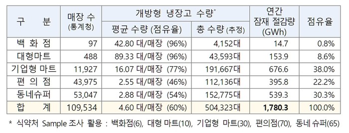 전국 식품매장 개방형 냉장고 수량은 총 504,323대에 달하며, Door형으로 개조‧교체시 1대당 연간 3.5MWh 절감 가능하다.
