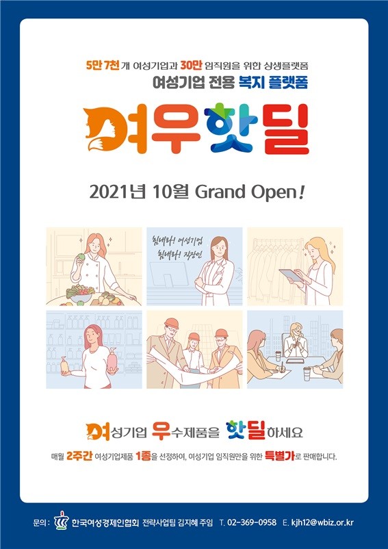 여성기업 우수제품 판매 플랫폼 ‘여우핫딜’(여성기업 우수제품을 핫딜하세요)은 여성기업 제품의 판로지원과 57,000여 개 여성기업에 종사하는 30만 임직원들을 위한 ‘상생형 판매&복지 플랫폼’이다.