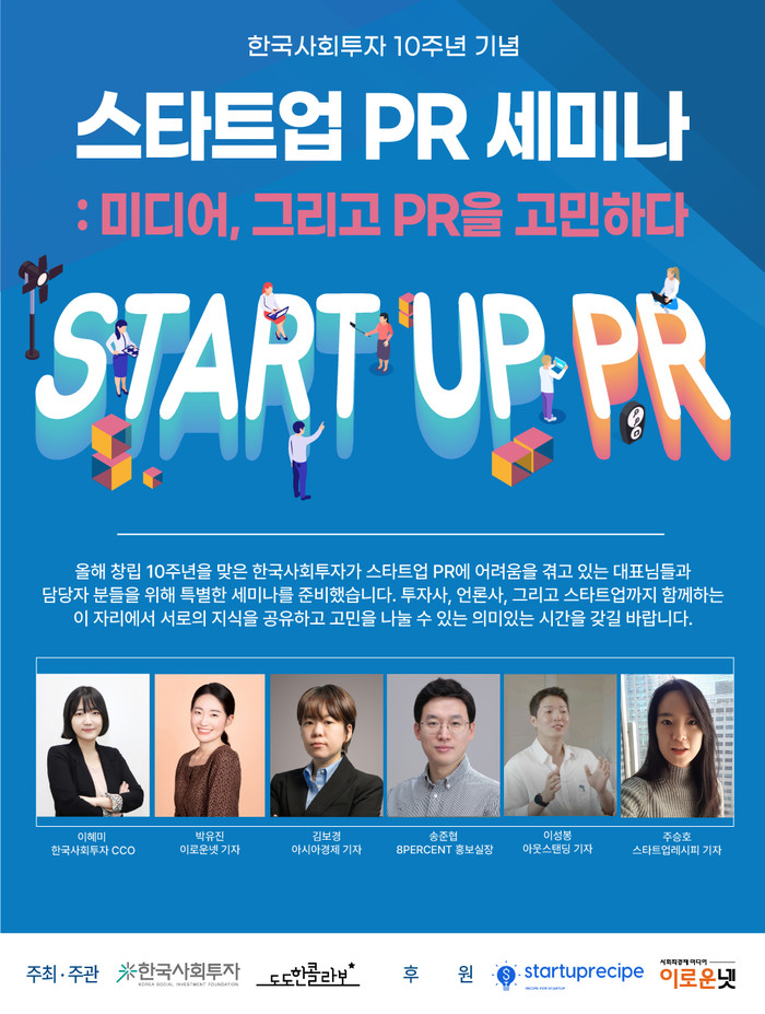 창립 10주년을 맞은 한국사회투자와 소셜벤처 도도한콜라보가 함께 마련한 이 자리에는 창업 생태계를 폭넓게 취재해 온 언론사 기자 4인과 스타트업 PR 전문가가 참여해 현장에서 체득한 경험과 지식을 나눌 예정이다.