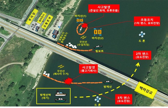 신속하고 정확한 상황전파 및 수습 체계, 하류 물이용시설 영향 차단, 초동대응 및 오염물질 확산 차단, 방제조치 등 사회재난 매뉴얼에 따른 기관별 사고 대응체계를 종합적으로 점검했다.
