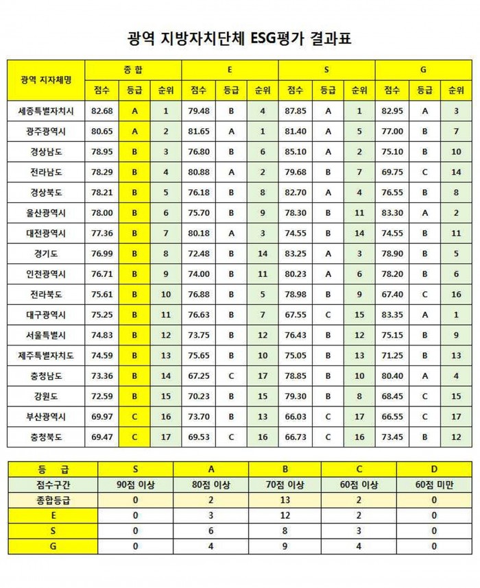 평가결과에 따르면 종합평점에서 S등급을 받은 광역자치단체는 없다. 하지만 세종특별자치시가 종합평점 82.68점·평가등급 A로 17개 광역자치단체 중 1위를 기록했다. 분야별로는 ▲환경(E) 79.48점·B등급 ▲사회(S) 87.85점·A등급 ▲지배구조·행정(G) 82.95점·A등급을 받았다.