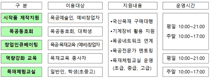 ‘목재문화진흥회’ 관련 전문가들은 목공관련 예비 창업자들을 위한 국산 목재 구매 대행, 목재 가공 장비 활용과 목공 네트워크 연계, 목공 전문가 멘토링 등의 통합 서비스를 지원하고 있다. 또한, 'CNC 라우터' 및 '레이저 조작기', '슬라이드 테이블 톱', '각도 조절기' 등의 전문장비들도 준비하고 있기에 역량 강화를 위해 큰 도움이 될 것으로 예상된다.