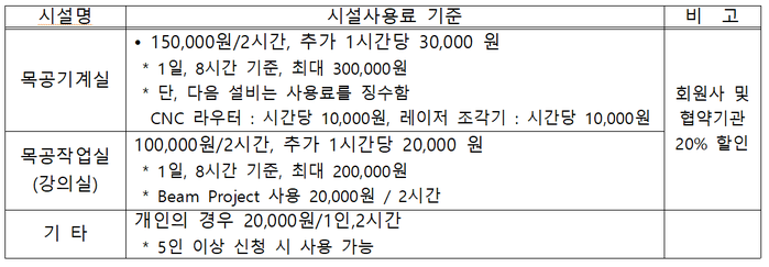 | ▲ 시설사용료는 작업실과 기계실 따로 징수하며, 회원사 및 협약기관은 할인 혜택이 있다. (사진출처=목재문화진흥회) |