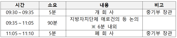 | ▲ 이번 간담회의 진행순서와 소요시간이다. (사진출처=중기부) |