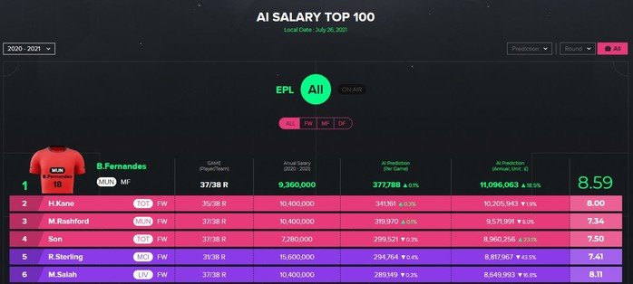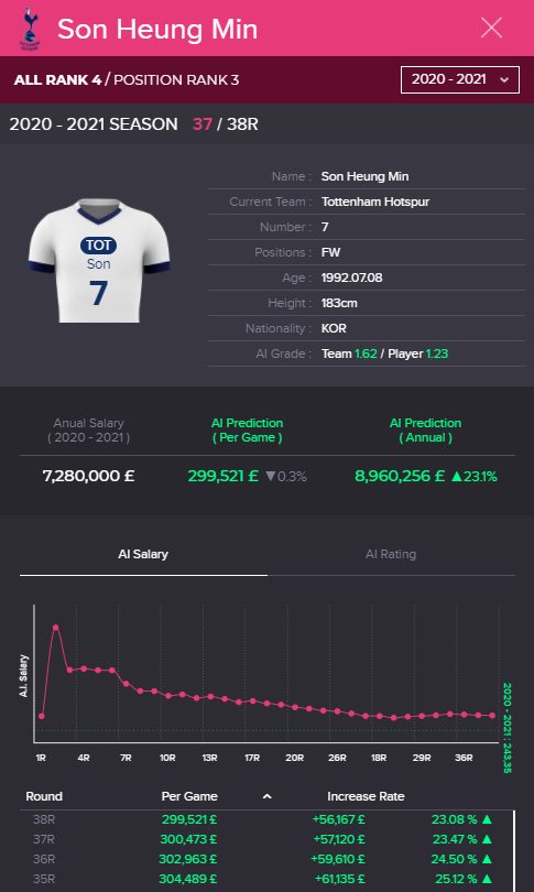 평균 평점(7.50)을 근거로 과거 연봉과 경기당 성과 달성 평점을 계산하여 AI 경기당 연봉의 차감을 평가하여 전체 선수의 연봉을 실시간 평가하는데, 손흥민 선수가 전체 연봉 순위 4위에 해당하는 매우 높은 랭킹에 평가되었다.