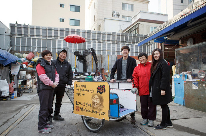 | ▲ 폐지수거 리어카의 옆에 광고를 부착하는 <끌림> 프로젝트 (사진출처=서울대학교 Blog) |
