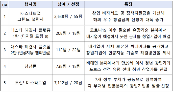 | ▲ 이번 연도에 진행한 5대 창업경진대회를 참여인원과 선정팀, 그리고 특징별로 구분했다. (사진출처=중기부) |