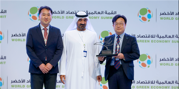 | ▲ 한국환경공단 글로벌협력처 윤현식 처장(우측), 국제협력부 이승훈 부장(좌측), 두바이에너지최고위원회의 Ahmed Buti Al Muhairbi(가운데), 수상 기념촬영을 하고 있다<사진제공=한국환경공단>. |