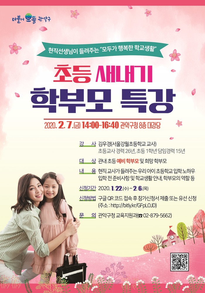 박준희 구청장은 “자녀의 초등학교 입학은 학부모에게 설렘과 두려움의 대상일 것”이라며 “미래의 사회인이 될 우리 가정의 자녀가 학교생활에 적응할 수 있는 실질적 도움을 줄 수 있으니 많은 참여를 기대한다.”고 덧붙였다.