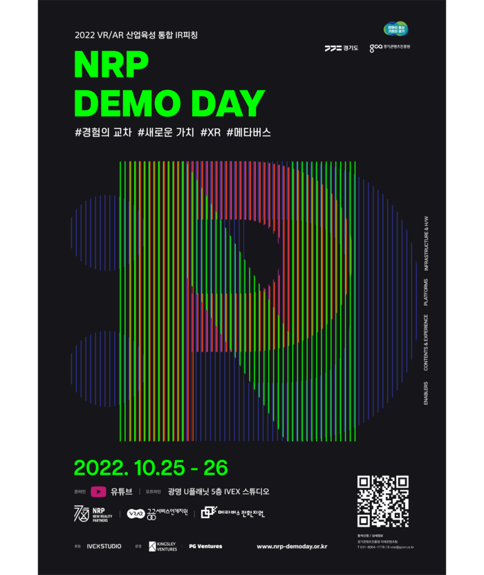 ‘엔알피(NRP) 데모데이’는 경기도 대표 가상/증강현실(VR/AR) 행사다. 올해는 가상/증강현실(VR/AR) 산업 생태계의 중심 경기도에서 ‘(가상에서 현실로, 현실에서 가상으로) 경험의 교차, 새로운 가치’라는 주제로 엔터테인먼트/공연, 전시/헬스케어, 관광, 교육/안전, 캠페인/의류, 패션/리테일 분야의 실험과 도전 등을 전망할 예정이다.