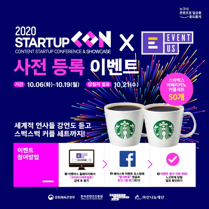 모집대상은 제한이 없으며, 참가하는 방법은 유튜브 ‘2020 글로벌 스타트업콘’ 페이지에서 국내·외 유명 인사 및 국내 스타트업 쇼케이스를 통해 시청할 수 있다. 또한, 이벤터스 홈페이지에서 참가를 신청하면 추첨을 통해 ‘스타벅스 커피세트’와 함께 세계적 연사의 친필 사인이 담긴 원문 도서고 획득할 수 있다.