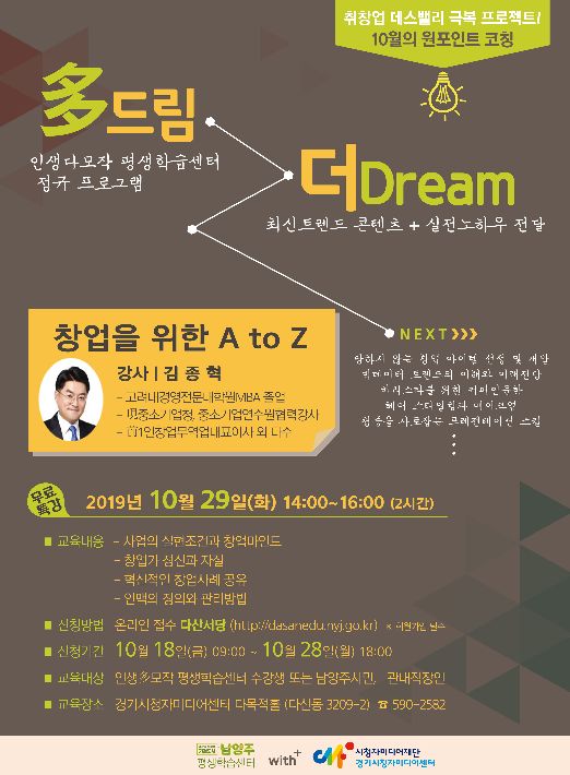 [더스타트 = 윤상학 기자] 남양주시 평생학습원은 오는 29일부터, ‘경기시청자 미디어센터’에서 취·창업 분야별 실전 노하우 및 최신 트렌드를 제공하는 ‘多Dream, One Point 코칭 특강’을 개최한다.