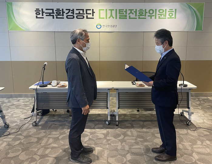 | ▲ 5.24(수) 중소기업DMC타워(서울 상암동)에서 열린 한국환경공단 디지털전환위원회 제1차 회의에서 한국환경공단 안병옥 이사장(우측)이 외부위원으로 위촉된 세종대학교 전자정보통신공학과 김재호 교수(좌측)에게 위촉장을 수여하고 있다. |