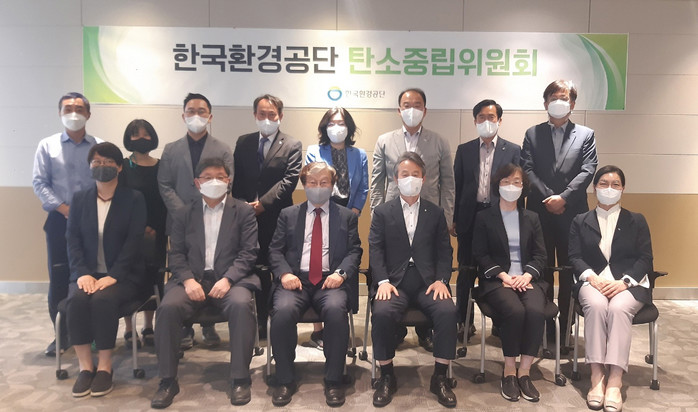 | ▲ 5.11(수) 중소기업DMC타워(서울 상암동)에서 열린 한국환경공단 탄소중립위원회 제1차 회의 후 위원들이 기념촬영을 하고 있다. 앞줄 오른쪽부터 세 번째 한국환경공단 안병옥 이사장, 네 번째 본 위원회 공동위원장인 세종대학교 기후에너지융합학과 전의찬 석좌교수 |