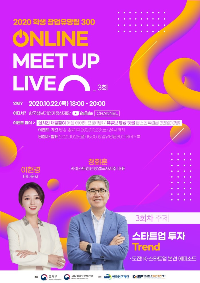 [더스타트 = 윤상학 기자] 교육부와 한국청년기업가정신재단은 오늘 오전, 스타트업 투자 Trend 의 방향을 모색하고 창업을 장려하는 목적으로 오는 22일 18시부터 22시까지 ‘제 3회 2020 학생 창업 유망팀 300’ 본선 에피소드의 「ONLINE MEET UP LIVE」를 유튜브를 통해 실시간으로 진행하겠다고 밝혔다.