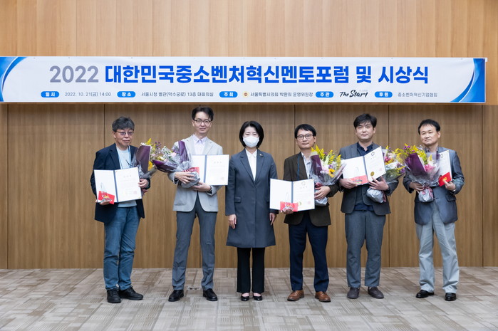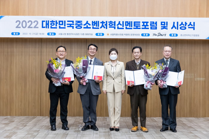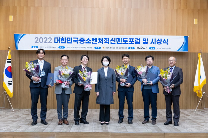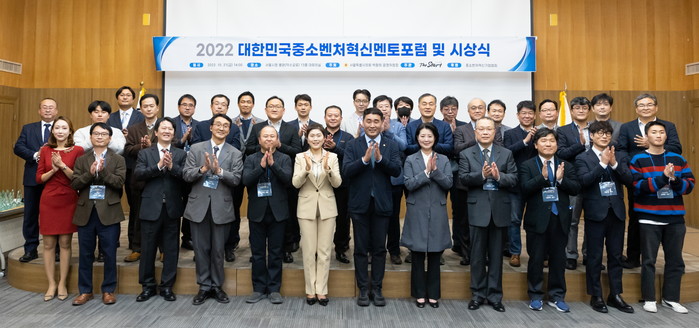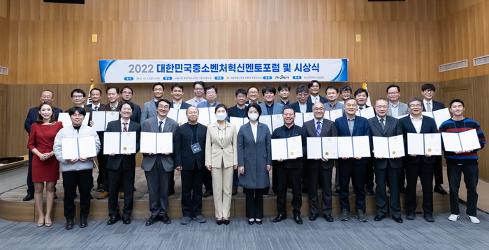 | ▲ ‘2022대한민국중소벤처혁신멘토 포럼 및 시상식’에서 수상한 수상자들이 사진촬영을 하고 있다<사진제공=중소벤처혁신기업협회>. |