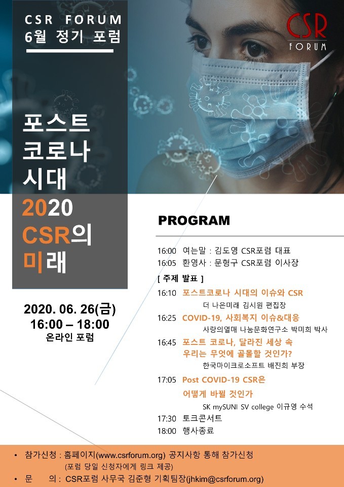 이번 온라인 포럼을 개최한 김도영 CSR포럼 대표는 “코로나19 사태는 사회 시스템을 바꾸고 있으며, 이로 인해 사회문제에 대한 재정의와 사회문제 해결 모델에 대한 새로운 고민이 시작되었습니다. 금번 포럼을 통해 이런 혼란의 상황을 함께 고민하고 새로운 돌파구를 찾아가는 계기가 되길 바랍니다”고 언급했다.