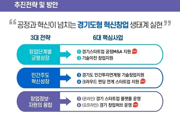 지원전략을 살펴보면 ▲창업단계별 균형성장, ▲민간주도 혁신성장, ▲창업 정보·자원의 융합 등 3대 전략과 6가지 핵심사업을 포함하고 있으며, 창업단계별 균형성장 전략에서는 '경기 스타트업 공정 M&A 지원'과 '기술이전 창업 지원 사업'을 시행하기로 했다.