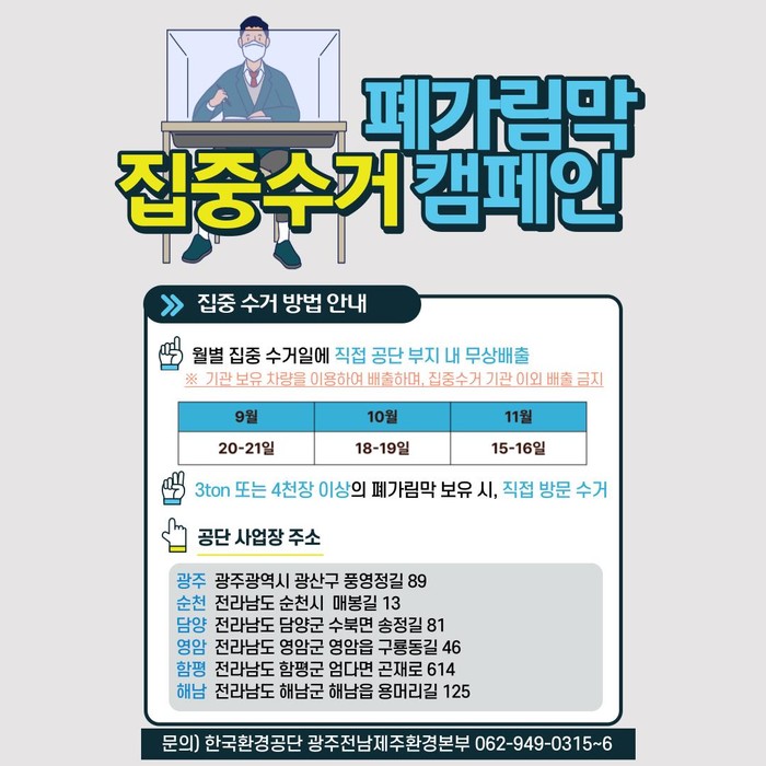 이에 공단에서는 보유 사업장 광주권역 1개소, 전남권역 5개소(담양, 순천, 영암, 함평, 해남)를 임시 개방하여 9월 20-21일, 10월 18-19일, 11월 15-16일로 3회에 걸쳐 배출되는 폐가림막을 모두 수용할 예정이다.