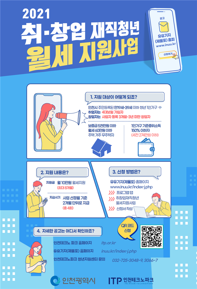 | ▲‘취·창업 재직 청년 월세 지원 사업’ 자격요건 및 포스터 (사진출처=인천시) |