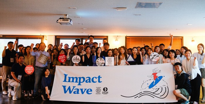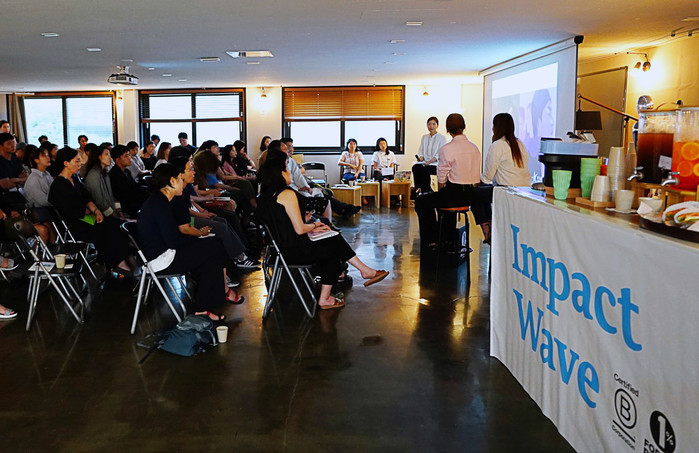 | ▲ 임팩트 웨이브 세션 사진_ 이날 행사에는 소셜벤처, 다국적 비콥 기업 등 60여 명이 한 자리에 모였다<사진제공=비랩코리아>. |