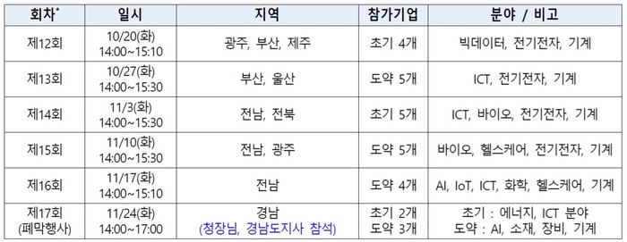 또한, 금일부터 시작되는 하반기 행사는 창조경제혁신센터, 특성화 대학 등이 공동으로 발굴한 호남·영남권역의 기술 창업 28개사가 총 6회에 걸쳐 40여 명의 투자자들에게 비대면 방식으로 기업설명을 할 예정이고, 회차별 참가기업의 기술 분야 및 성장단계를 고려해서 맞춤형 투자자를 선별적으로 모집해 투자의 가능성을 상승시켰다.