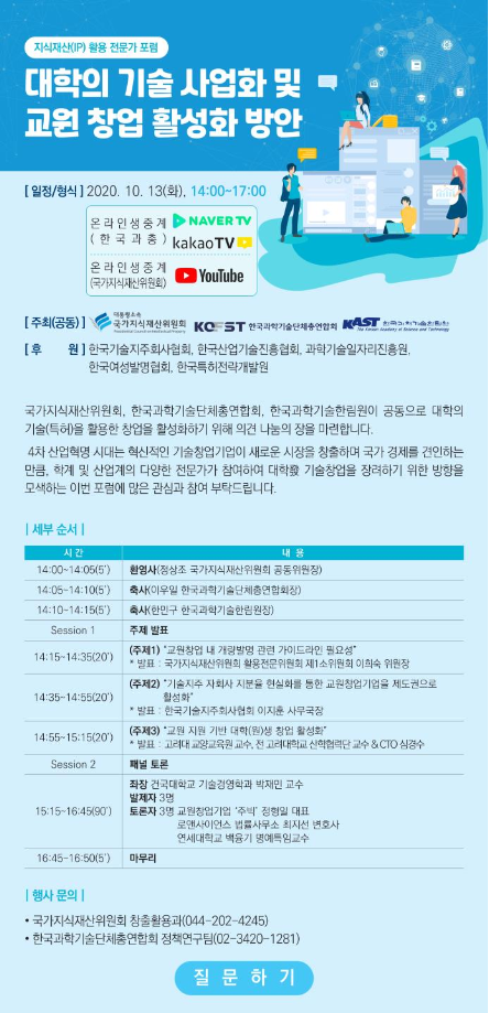 [더스타트 = 윤상학 기자] 대통령 직하 국가지식재산위원회는 한국과학기술단체총연합회 및 한국과학기술한림원과 공동으로 금일 13일 오전, ‘대학 기술 사업화 및 교원 창업 활성화 방안’을 주제로 ‘지식 재산 활용 분야 전문가 대중 토론회’를 개최했다고 밝혔다.