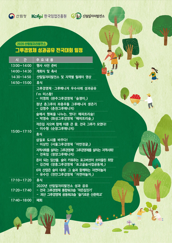[더스타트 = 한미경 기자] 산림청은 지난 18일, 1년간의 성과를 공유하고 전국의 그루매니저 및 그루경영체 간의 소통을 통한 연대와 협력을 강화하는 「2020년 산림 일자리 발전소 성과공유 전국대회」를 온라인으로 개최했다고 밝혔다.