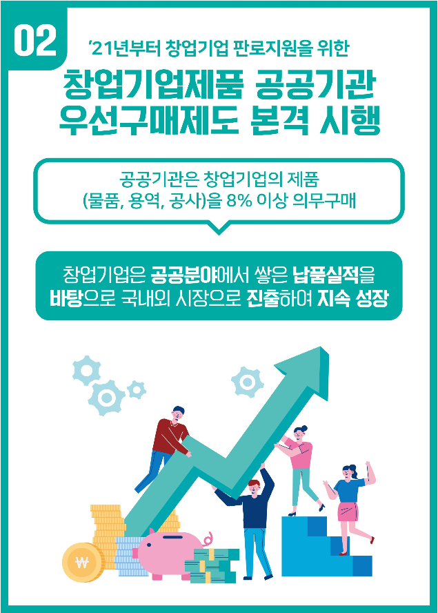 - 창업 기업 제품 공공기관 우선 구매 제도 : 구매 계약 금액 8% 적용 → 자율권 보장과 취지 실현