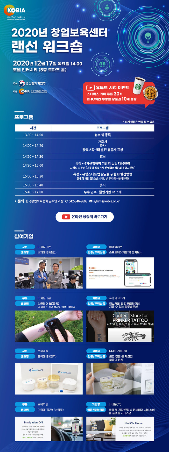 | ▲ '2020 창업보육센터 랜선 워크숍' 에 참여하는 기업과 내용을 담은 포스터이다. (사진출처=중기부) |