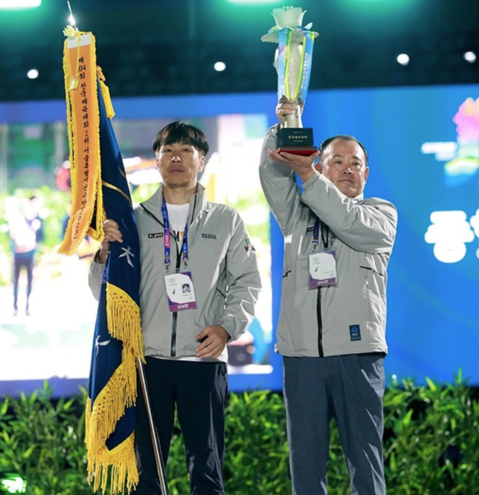 | ▲ 19일 종합 준우승 시상대에 오른 김성범 서울시체육회 부회장(오른쪽)과 류준현 경기운영부장(왼쪽)<사진제공=서울시체육회> |