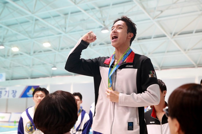 | ▲ 19일 열긴 수구 고등부 경기에서 금메달 획득 후 환호하고 있는 서울체고 선수 <사진제공=서울시체육회> |