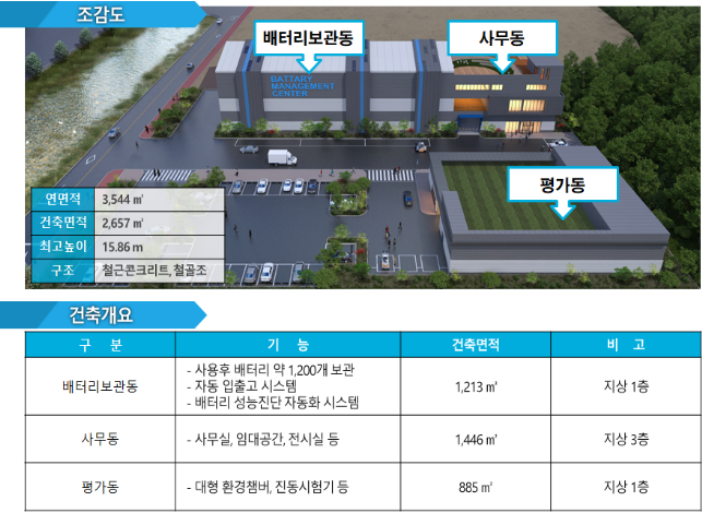 금번에 착공된 ‘2차전지 종합관리센터’는 ‘21년 상반기 준공을 목표로 총 107억 원의 사업비가 투입돼, 연면적 3,544㎡ 지상 3층 규모로 건설되며 배터리 보관동과 사무동 그리고 평가동으로 구성될 예정이다.
