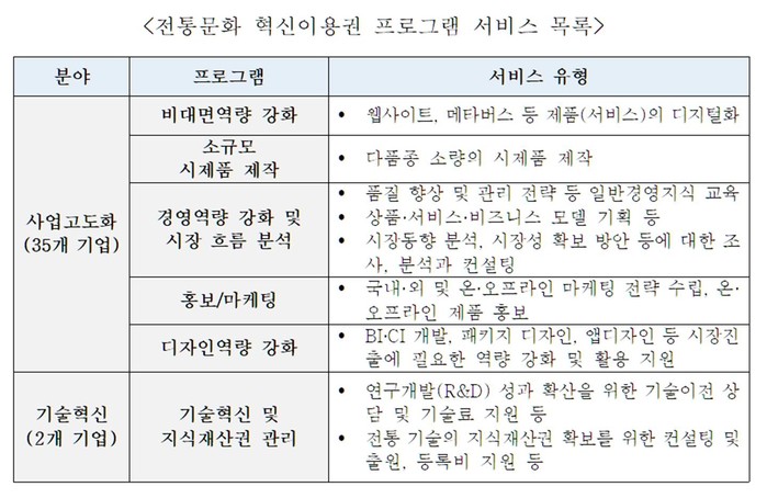 올해 처음 시범사업으로 시행하는 전통문화 혁신이용권 사업(이하 바우처 사업)은 기술이전, 경영 컨설팅, 홍보, 디자인 서비스 등을 이용권 형태로 지원하는 사업으로 전통문화산업을 활성화하고 기업 역량을 강화하기 위해 마련됐다.